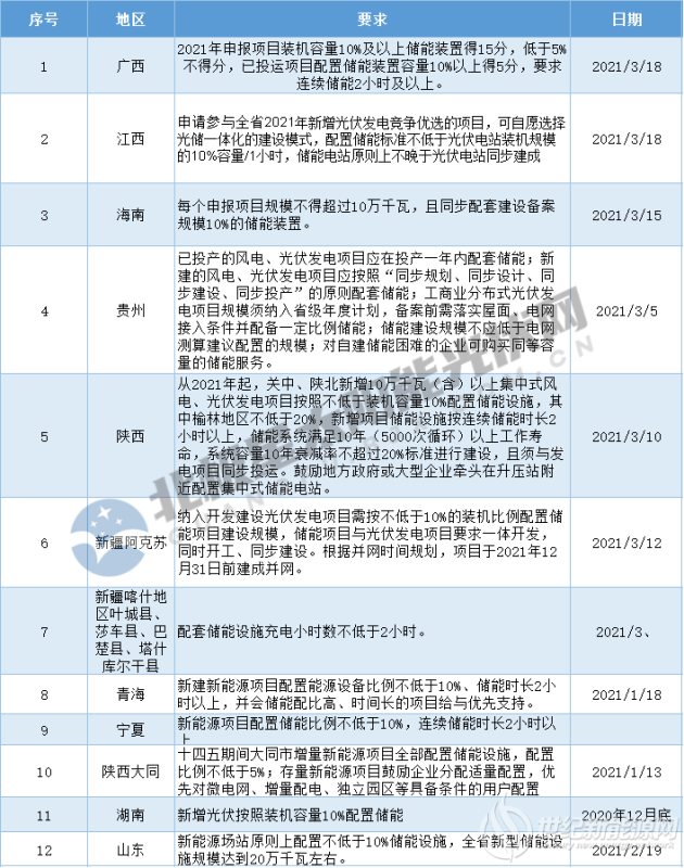 配置儲能已成為“十四五”期間建設(shè)光伏項(xiàng)目的必選項(xiàng)。據(jù)北極星太陽能光伏網(wǎng)統(tǒng)計(jì),截至目前全國約20個(gè)地區(qū)出臺了光伏+儲能相關(guān)政策。2021開年以來,已有廣西、江西、貴州、山東、海南等12個(gè)地區(qū)要求新能源項(xiàng)目強(qiáng)配儲能,比例在5%~10%之間,連續(xù)儲能在2小時(shí)及以上。