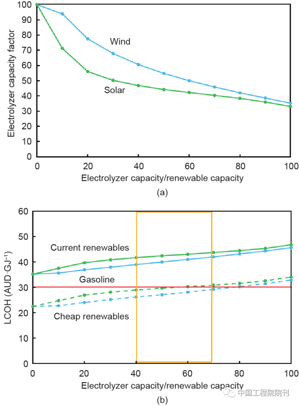 要使電解器容量系數(shù)高而又不依賴于固化的另一種方法是,相對于供應(yīng)電解器的可再生能源而言,減小電解器的尺寸。如圖2所示,容量遠(yuǎn)小于可再生能源供應(yīng)的電解槽的容量系數(shù)趨于100%,而容量與可再生能源相同的電解器,具有與供應(yīng)可再生能源的電解槽相同的容量系數(shù)。盡管非常高的容量系數(shù)似乎很有吸引力,但小型電解槽幾乎不產(chǎn)生氫氣。鑒于我們的電力和運(yùn)輸燃料系統(tǒng)的規(guī)模相似,因此我們可以選擇生產(chǎn)相似數(shù)量的兩者,如圖2(b)中的黃色方框所示。