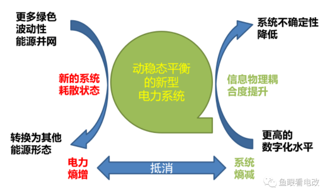 第三,新型電力系統(tǒng)是新的技術(shù)模式,這個(gè)技術(shù)方式最重要的不是體現(xiàn)在一次系統(tǒng)、或者二次系統(tǒng),而是一次、二次、三次(信息&數(shù)據(jù))的結(jié)合方式,是一種強(qiáng)信息物理融合(CPS)關(guān)系,不是結(jié)合,是融合。就第一性原理而言,新型電力系統(tǒng)在各個(gè)電壓等級都面臨波動(dòng)性、間歇性能源大規(guī)模并網(wǎng)帶來的指數(shù)級“熵增困境”,原有的面向穩(wěn)態(tài)可控電源的電力技術(shù)系統(tǒng)面臨的挑戰(zhàn)巨大,那么必須依靠信息熵的指數(shù)級增加,才能對沖電力一次系統(tǒng)的熵增,在CPS的強(qiáng)融合條件下實(shí)現(xiàn)新的熵平衡。