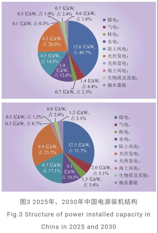 近中期中國新能源呈“倍增”式發(fā)展,各類電源之間呈現(xiàn)多元化發(fā)展態(tài)勢?!笆奈濉逼陂g,新能源規(guī)??焖偬嵘昃鲩L1.0億~1.2億kW。2025年,新能源裝機(jī)規(guī)模達(dá)到11億kW左右,占比35%左右。在“十五五”初期,煤電裝機(jī)規(guī)模達(dá)到峰值,為12億~13億kW;新能源裝機(jī)規(guī)模進(jìn)一步提升,2030年裝機(jī)容量達(dá)到17億kW左右,占比達(dá)到約44%。