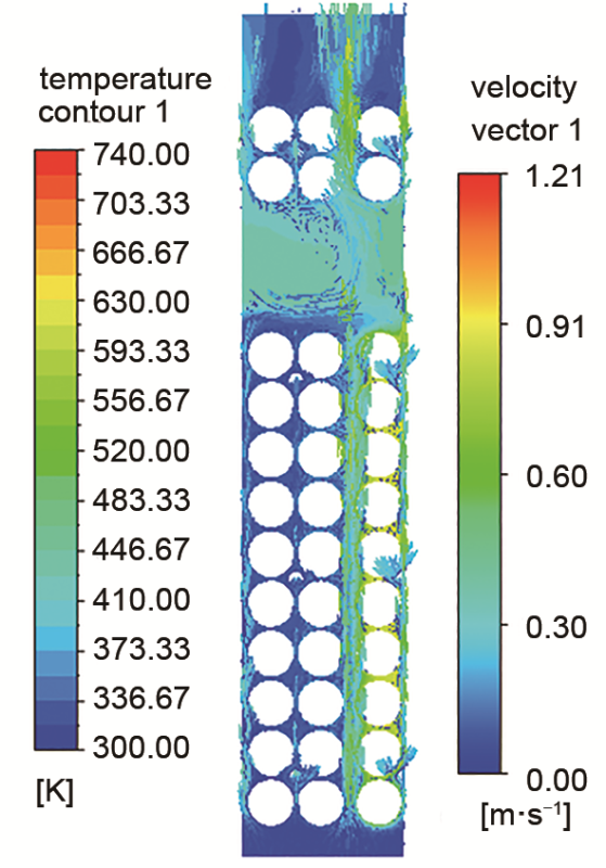 圖8 t=2504.4電芯截面溫度云圖及速度矢量