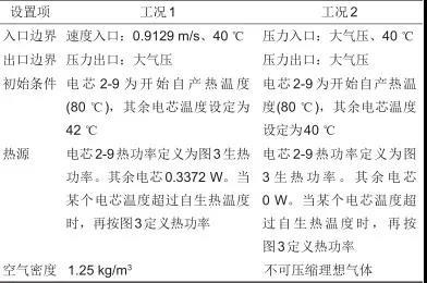 在工況1(電池按額定功率持續(xù)運(yùn)行)、工況2(電池系統(tǒng)停止工作,空調(diào)機(jī)組停運(yùn))這兩種工況時(shí)熱失控后對(duì)其余電芯影響最大。使用Fluent軟件及其DO輻射傳熱模型進(jìn)行仿真計(jì)算,電芯表面與空氣進(jìn)行共軛傳熱(couple邊界),熱失控電芯生熱速率通過自定義函數(shù)(UDF)定義,其余相關(guān)設(shè)置見表1。