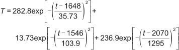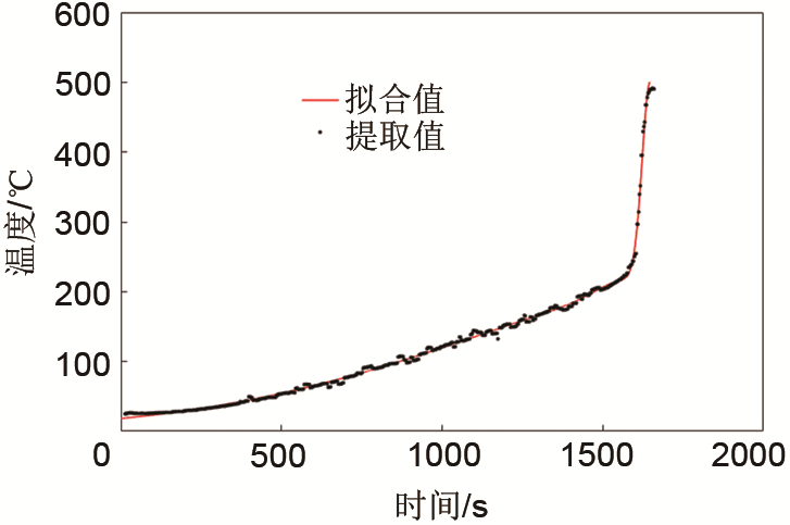 絕熱測(cè)試中,當(dāng)電池溫度達(dá)到最高值以后不再生熱,溫度降低,計(jì)算熱失控生熱功率時(shí)只需考慮從自產(chǎn)熱到溫度最高這個(gè)過程。因此通過MATLAB編程提取了圖1中100% SOC電池?zé)崾Э販囟冗_(dá)到最高值前的數(shù)據(jù)。再將提取的離散點(diǎn)通過高斯函數(shù)擬合,擬合函數(shù)見式(2),函數(shù)曲線見圖2。