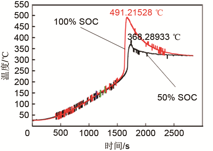 對(duì)于磷酸鐵鋰電池T1為80~160 ℃,T2為150~250 ℃,單體絕熱環(huán)境熱失控以后的最高溫度大都不超過500 ℃,圖1為某磷酸鐵鋰電池?zé)崾Э販囟惹€[8]。