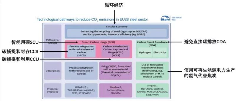 據(jù)2018年的一份報(bào)告,歐盟28國(guó)探討了鋼鐵行業(yè)減少碳排放的技術(shù)路線,其中包括循環(huán)經(jīng)濟(jì),智能用碳SCU技術(shù)以及避免直接碳排放CDA技術(shù)。