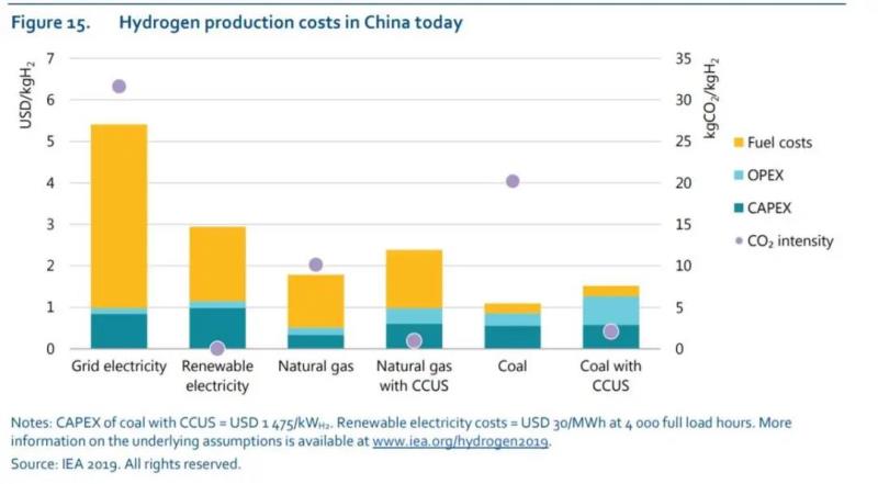 根據(jù)國(guó)際能源署匯總數(shù)據(jù),在中國(guó)生產(chǎn)氫氣各種不同技術(shù)路徑的成本、碳強(qiáng)度如下