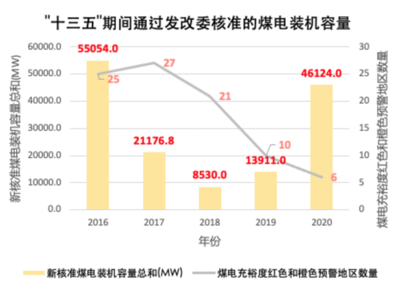 早在2016年,中國(guó)國(guó)家發(fā)改委和國(guó)家能源局就已實(shí)施建立煤電風(fēng)險(xiǎn)預(yù)警機(jī)制以約束煤電裝機(jī)核準(zhǔn)規(guī)模。為消解在“十二五”時(shí)期核準(zhǔn)通過(guò)的大量煤電,2016~2018年,各地方通過(guò)核準(zhǔn)的煤電裝機(jī)容量一度大幅下降。然而,在“十三五”后半期,即2019~2020年,煤電項(xiàng)目核準(zhǔn)再次出現(xiàn)逐年上升的趨勢(shì)。2020年一年內(nèi)新通過(guò)發(fā)改委核準(zhǔn)的煤電裝機(jī)總量為46.1GW,占“十三五”期間通過(guò)發(fā)改委核準(zhǔn)總和的約31.9%。