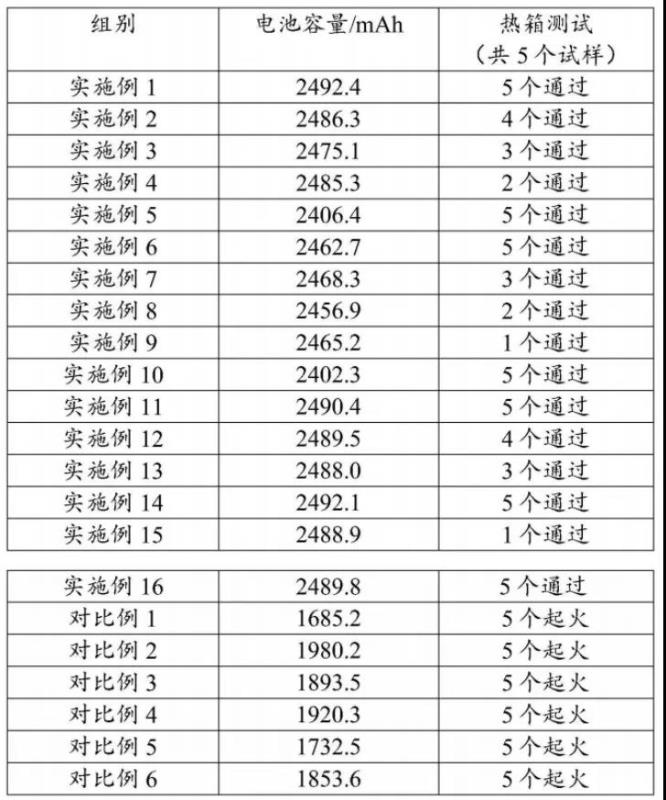 通過該測試的標準為:電池無冒煙、無起火、無爆炸。最終從實施例1-16可知,使用該專利的具有包覆層的添加劑能有效改善電池的安全性能。