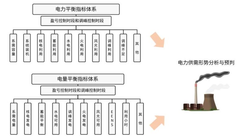 東北電力中短期供需預(yù)判的監(jiān)管指標(biāo)體系包括電力電量平衡指標(biāo)體系和綜合監(jiān)管指標(biāo)體系設(shè)計(jì)?;诰?xì)化運(yùn)行模擬的結(jié)果,通過(guò)構(gòu)建電力電量平衡指標(biāo)體系對(duì)電力供需形勢(shì)進(jìn)行分析預(yù)判(見圖3)。