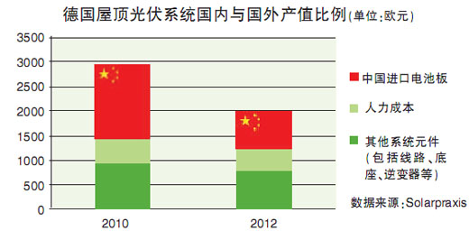 德國根本不用擔心國內(nèi)市場。以2010年為例,當年德國屋頂太陽能組件的市場價格約為2900歐元/千瓦。據(jù)柏林一家頂尖的可再生能源工程服務公司Solarpraxis統(tǒng)計,在德國安裝的屋頂光伏系統(tǒng)中,線路、底座和逆變器多半是國內(nèi)原產(chǎn),這些部分占了整個系統(tǒng)造價的近一半。目前從中國進口的太陽能電池板造價已經(jīng)跌到700歐元/千瓦,但上述其他組件價格卻沒怎么大跌。如此推算,德國國內(nèi)市場份額實際上在不斷擴大,電池板在裝機成本中所占比例已經(jīng)下降了許多。