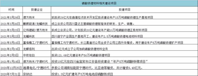 從需求端來看,包括寧德時代、比亞迪、合肥國軒、億緯鋰能、鵬輝能源等電池企業(yè)都在加強(qiáng)其LFP電池的布局,進(jìn)而通過增資入股或與材料企業(yè)合資建廠的方式鎖定上游優(yōu)質(zhì)LFP材料產(chǎn)能,保障其原料供應(yīng)穩(wěn)定和降低采購成本。