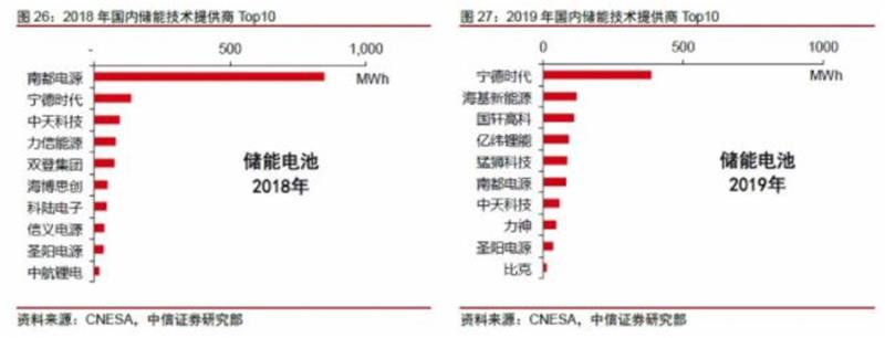 對(duì)比2018-2019年中國(guó)儲(chǔ)能技術(shù)提供商(即電池提供商)Top10企業(yè)的變化即可看到,寧德時(shí)代、國(guó)軒高科、億緯鋰能等國(guó)內(nèi)動(dòng)力電池領(lǐng)先企業(yè),儲(chǔ)能裝機(jī)量均在2019年取得了明顯的同比增長(zhǎng)。
