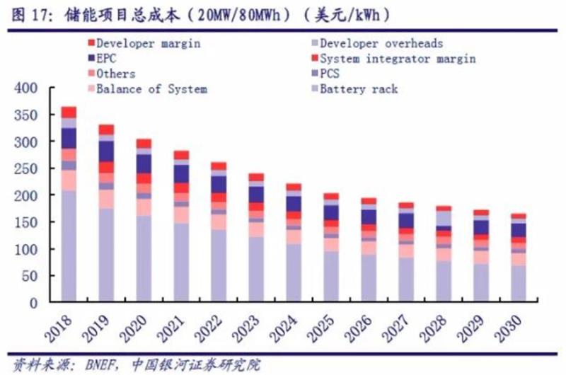 與之對(duì)應(yīng)地,根據(jù)BNEF調(diào)研,2019年一個(gè)完成安裝的4小時(shí)電站級(jí)儲(chǔ)能系統(tǒng),成本范圍在300-445美元/kWh之間。BNEF預(yù)測(cè),2020年單kWh成本仍將高于300美元,至2025和2030年有望降至203美元和165美元。