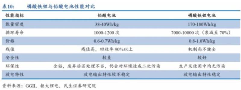 磷酸鐵鋰電池能量密度可達(dá)鉛酸電池的4-5倍,且在安全性、循環(huán)壽命、快速充放性能等方面優(yōu)勢(shì)明顯。盡管目前磷酸鐵鋰電池價(jià)格仍高于鉛酸電池,但在全生命周期成本評(píng)價(jià)體系下,由于擁有更長(zhǎng)的循環(huán)壽命,磷酸鐵鋰電池已幾乎抹平了成本劣勢(shì),且未來(lái)幾年仍有降本空間。