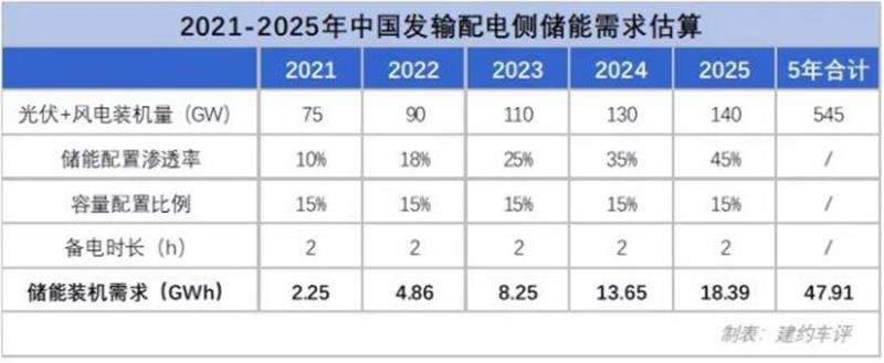 以光伏+風(fēng)電裝機(jī)增量為測(cè)算依據(jù),并考慮儲(chǔ)能配置滲透率逐漸提升,容量配置比例取15%,容量時(shí)長(zhǎng)取2小時(shí),預(yù)計(jì)我國(guó)2021-2025年發(fā)輸配電側(cè)(即電表前端)的儲(chǔ)能裝機(jī)需求約為48GWh。