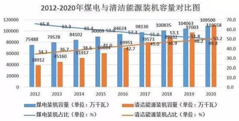 值得注意的是,在連續(xù)多年的清潔發(fā)電高速增長(zhǎng)和煤電緩增長(zhǎng)后,2020年底,中國(guó)煤電總裝機(jī)容量占比首次下降到50%以下。