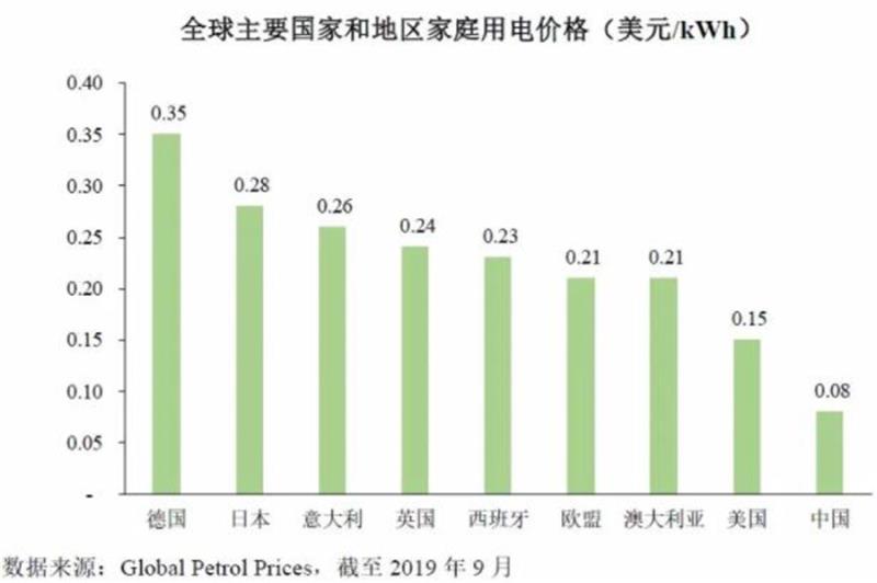 與中國(guó)相比,一些發(fā)達(dá)國(guó)家的居民用電成本高昂。根據(jù)Global Petrol Prices數(shù)據(jù),德國(guó)、日本、英國(guó)、澳大利亞和美國(guó)的居民用電均價(jià)分別為0.38、0.29、0.26、0.25和0.15美元/kWh,而中國(guó)民用電價(jià)僅為0.08美元/kWh。