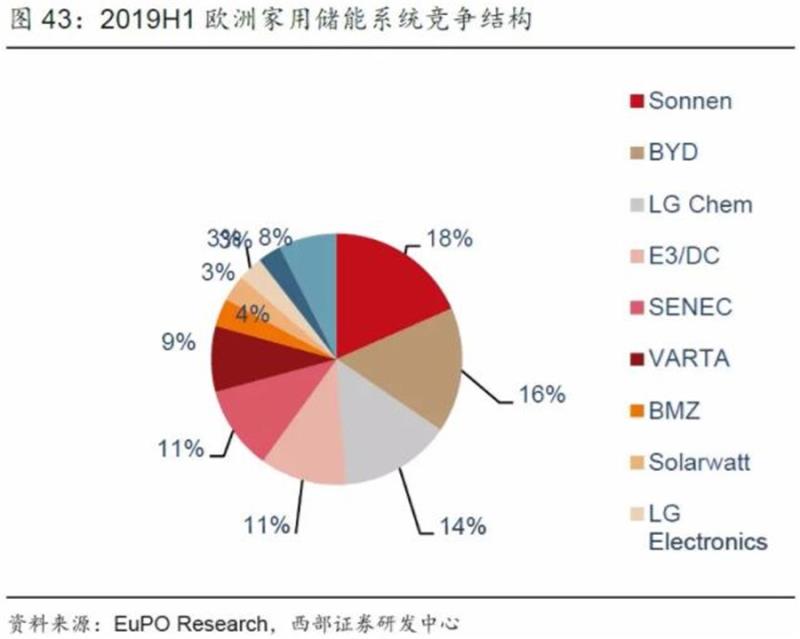 根據(jù)EuPO Research數(shù)據(jù),2019年上半年,比亞迪在歐洲家用儲(chǔ)能系統(tǒng)的市場(chǎng)份額為16%,僅排在Sonnen之后位列第二。
