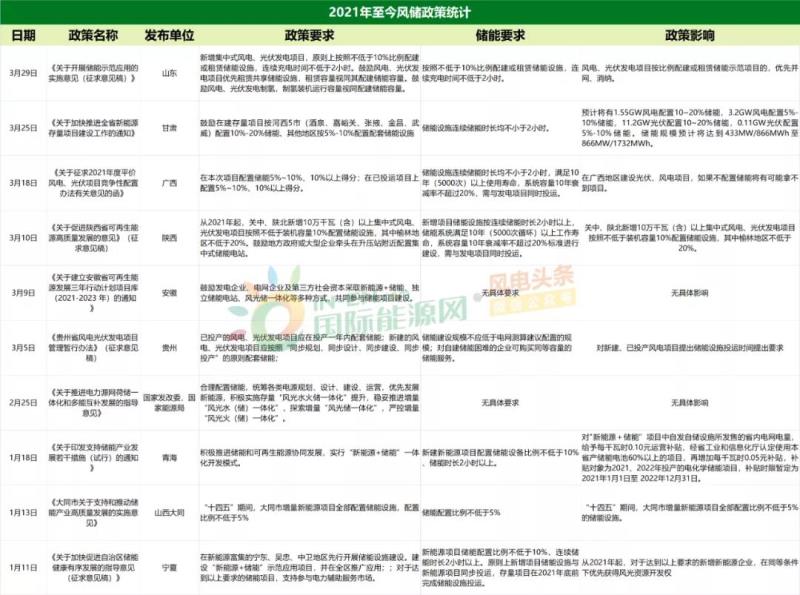據(jù)國(guó)際能源網(wǎng)/風(fēng)電頭條(微信號(hào):wind-2005s)記者不完全統(tǒng)計(jì),2021年至今,共有10個(gè)省份出臺(tái)了較為具體的風(fēng)電+儲(chǔ)能相關(guān)政策。包括山東、甘肅、廣西、陜西、安徽、貴州、青海、寧夏、山西大同等省份。