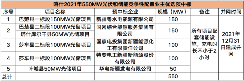 中國儲能網(wǎng)訊:近日,新疆喀什2021年550MW集中式光伏儲能項目競爭性配置項目中標(biāo)候選人全部公示,根據(jù)第一中標(biāo)候選人來看,新疆粵水電與國網(wǎng)綜合能源分別預(yù)中標(biāo)150MW,國家電投與特變電工分別預(yù)中標(biāo)100MW,華電預(yù)中標(biāo)50MW。具體見下: