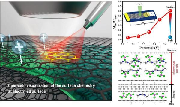 Langmuir、Ertl 等人建立起來(lái)的表面化學(xué)方法學(xué)能夠獲得固體表面結(jié)構(gòu)和化學(xué)信息,已在多相催化等領(lǐng)域中取得成功,但將這些技術(shù)應(yīng)用到電化學(xué)過(guò)程的原位表界面表征仍充滿挑戰(zhàn)。近年來(lái),傅強(qiáng)團(tuán)隊(duì)探索利用表面化學(xué)方法學(xué)來(lái)研究電化學(xué)表界面問(wèn)題。該工作中,研究人員通過(guò)長(zhǎng)期探索,構(gòu)建出適合原位表面表征的模型電池,設(shè)計(jì)了一系列相關(guān)的原位樣品池和樣品臺(tái),實(shí)現(xiàn)了對(duì)鋁離子電池過(guò)程的多種在線表界面表征,包括 XPS、AFM、SKPM、Raman、掠角 XRD 等。研究發(fā)現(xiàn),充電過(guò)程中石墨電極表面區(qū)域陽(yáng)離子(EMI+)與陰離子(AlCl4-)共插層嵌入到石墨層間,證實(shí)電極表面區(qū)域的插層離子超富集現(xiàn)象;基于電極過(guò)程的精準(zhǔn)在線測(cè)量,研究人員首次給出鋁離子電池電極反應(yīng)的定量描述,揭示儲(chǔ)能電極存在明顯的表面效應(yīng),利用該效應(yīng)構(gòu)建以超薄石墨為電極的電池器件實(shí)現(xiàn)了容量翻倍。