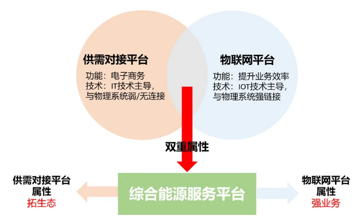 定位一:平臺(tái)屬性上,成為交易、運(yùn)營等海量信息的匯聚樞紐和流量入口,兼具供需對(duì)接與物聯(lián)網(wǎng)平臺(tái)雙重屬性。綜合能源服務(wù)平臺(tái)不同于京東、淘寶等電商平臺(tái),其本質(zhì)上還有支撐形成物理系統(tǒng)解決方案的需求,所以具有供需對(duì)接平臺(tái)和工業(yè)互聯(lián)網(wǎng)平臺(tái)雙重屬性,并在雙重屬性的驅(qū)動(dòng)下掌握用戶交易信息、物理系統(tǒng)運(yùn)行信息等信息入口,實(shí)現(xiàn)綜合能源服務(wù)業(yè)務(wù)的線上引流匯聚,打造線上線下融合新型生態(tài)。