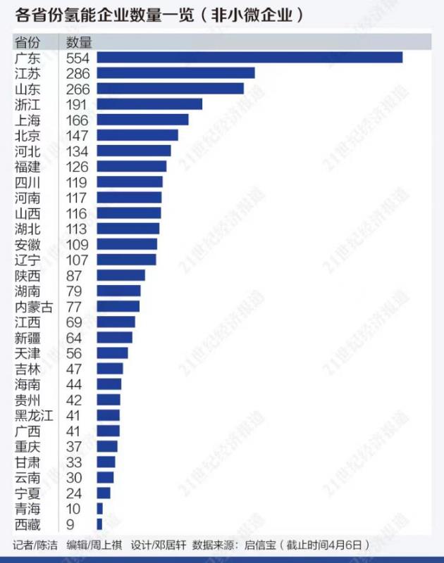 一個(gè)直接的數(shù)據(jù),就是各地氫能企業(yè)的數(shù)量,和風(fēng)能企業(yè)相比差距很大。啟信寶數(shù)據(jù)顯示,主營(yíng)業(yè)務(wù)中含有氫能的非小微企業(yè),全國(guó)不足3500家,其中廣東以超過(guò)500家的數(shù)量排名全國(guó)各省區(qū)市第一位。排名第二和第三的是江蘇和山東,分別有286家和266家,17個(gè)省區(qū)市的氫能企業(yè)數(shù)量不足100家。