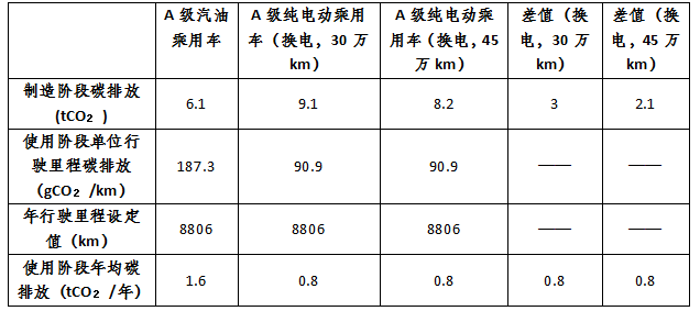 另外,換電模式下,動(dòng)力蓄電池利用率較高,將A級(jí)純電動(dòng)汽車減排滯后期降低到2年~4年(如下表所示),即A級(jí)純電動(dòng)汽車使用2年~4年即可抵消其生產(chǎn)階段較A級(jí)汽油車高出的碳排放。
