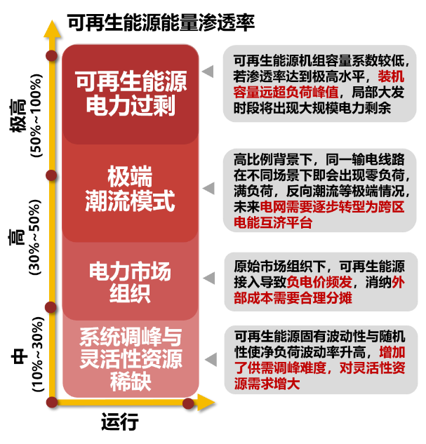在運行時間尺度上,可再生能源帶來的一系列挑戰(zhàn)源自于其固有波動性與隨機性。風(fēng)光可再生能源電源出力上限通常不可調(diào)度,系統(tǒng)調(diào)峰與電力市場組織問題,在中比例滲透階段的時候便會出現(xiàn),隨著滲透率的增加,問題逐漸凸顯。極端潮流模式與大發(fā)電力過剩的問題,在高比例與極高比例滲透階段才會出現(xiàn)。高比例可再生能源滲透對系統(tǒng)經(jīng)濟安全運行的挑戰(zhàn)總結(jié)如圖3所示。