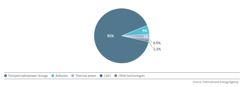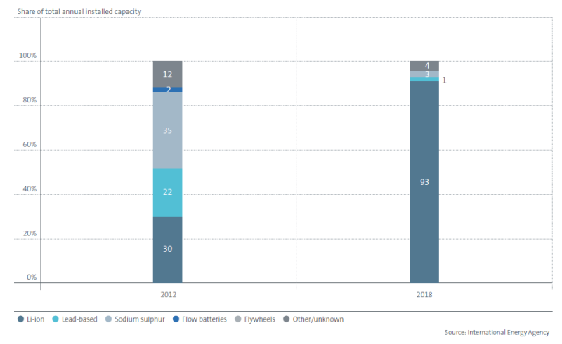 在所有可用電池中,鋰電池占據(jù)主要的市場(chǎng)地位,除PSH以外,鋰離子技術(shù)的變體占新能源存儲(chǔ)裝置的90%以上,而飛輪和超級(jí)電容器等短期技術(shù)則低于2%。