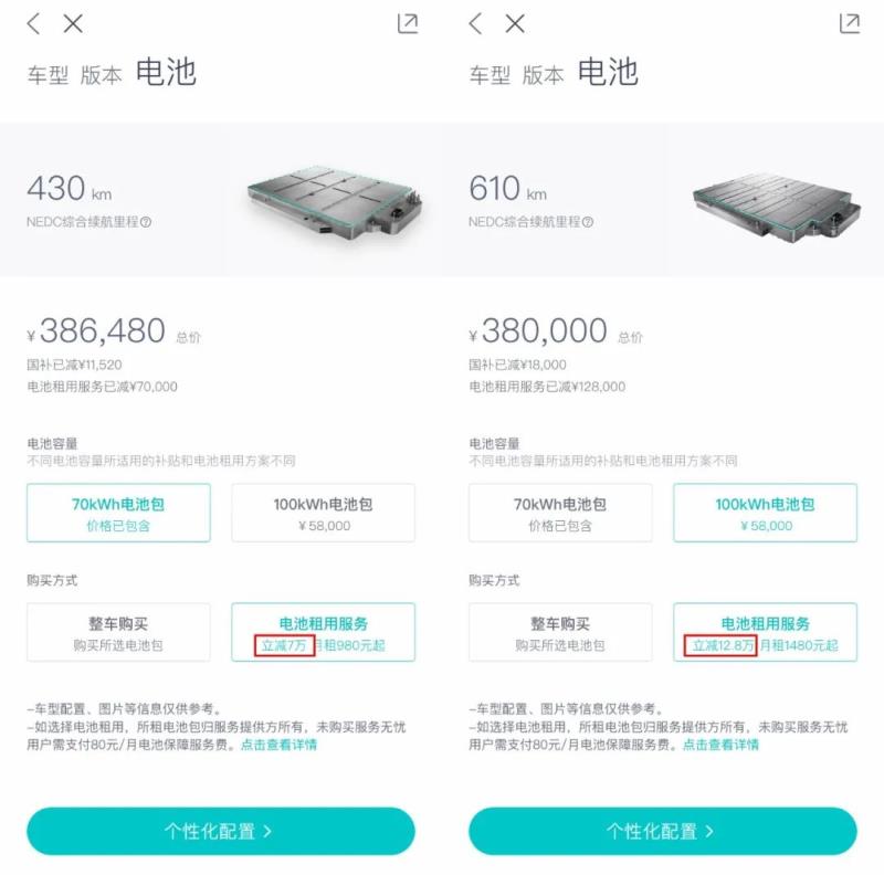 “選裝續(xù)航420公里的電池包可以便宜7萬(wàn)元,選裝610公里的電池包可以便宜12.8萬(wàn)元,相當(dāng)于省掉了電池包的價(jià)格。”該銷售人員表示,這就是“電池租賃”模式,日后每月支付980元租金即可,因?yàn)橘I(mǎi)蔚來(lái)車(chē)可以送充電樁,如果裝充電樁,每月有4次免費(fèi)換電服務(wù),如果不裝充電樁,每月有6次免費(fèi)換電服務(wù)。該銷售人員建議,如果三五年會(huì)換車(chē),租比較合算。