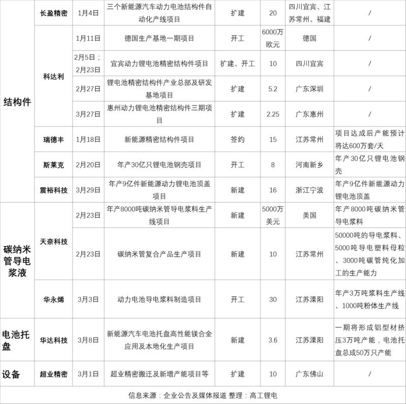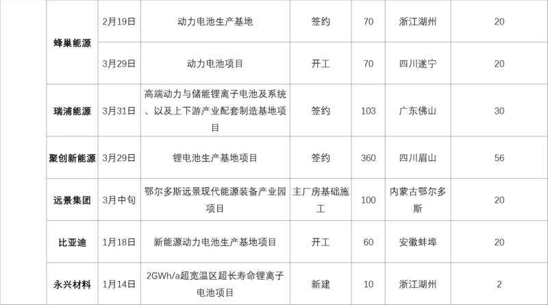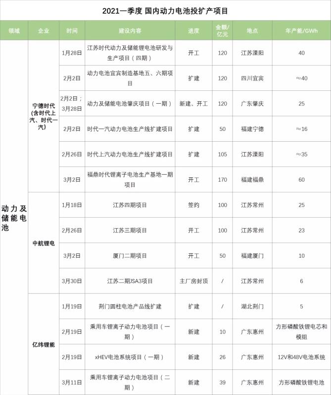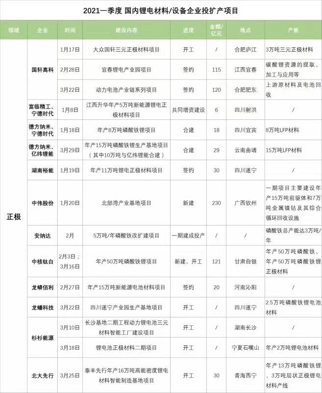 以下為高工鋰電整理的2021年一季度投擴產(chǎn)項目: