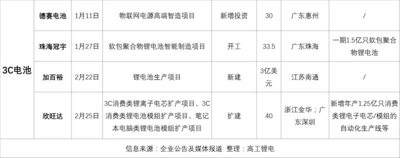 另外3C龍頭企業(yè)如德賽電池、欣旺達、珠海冠宇均密集擴產(chǎn),帶動產(chǎn)能規(guī)模集體上量。