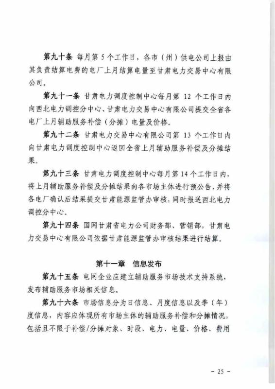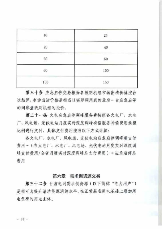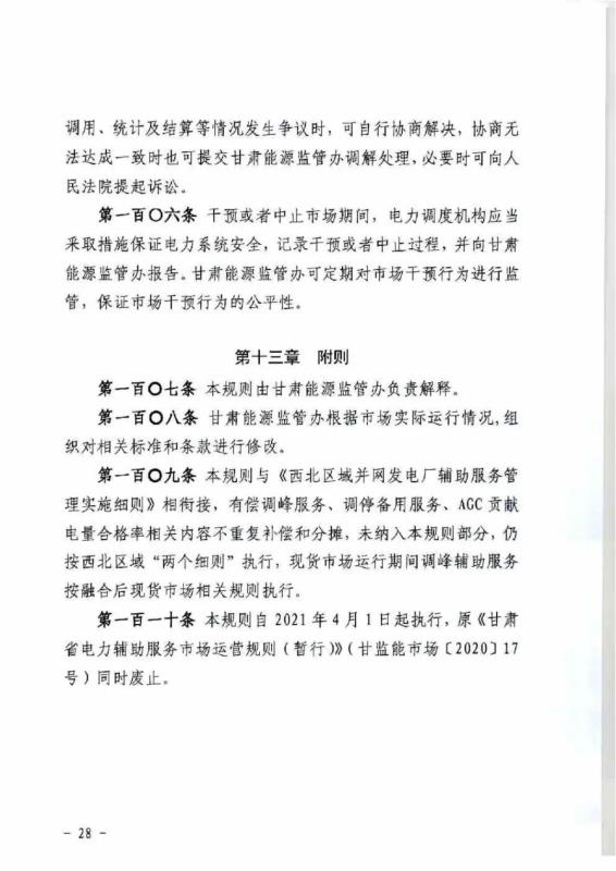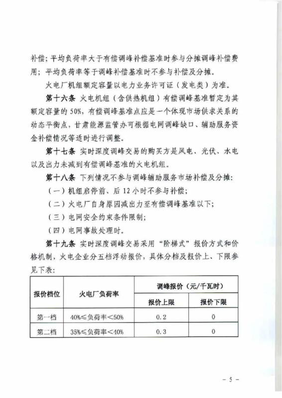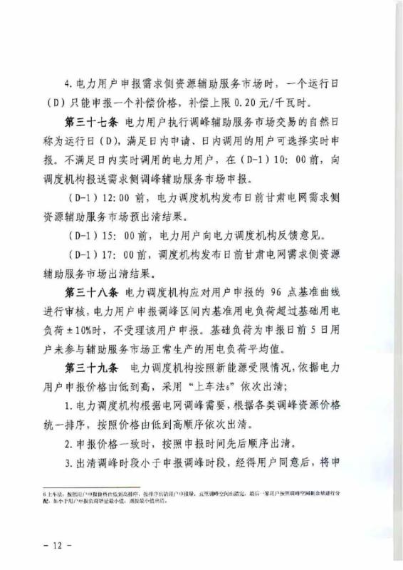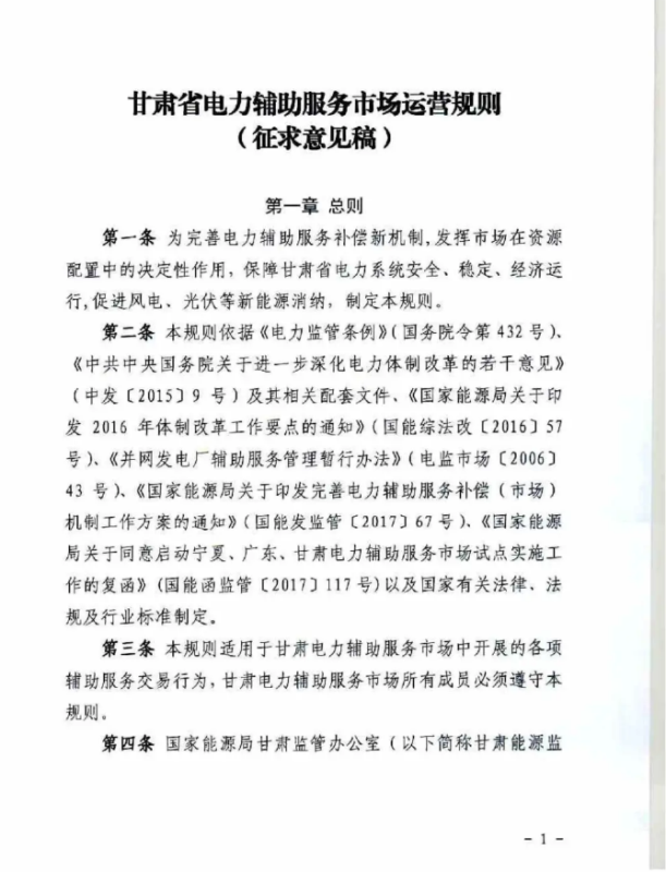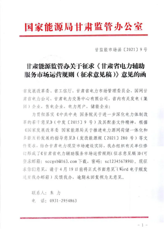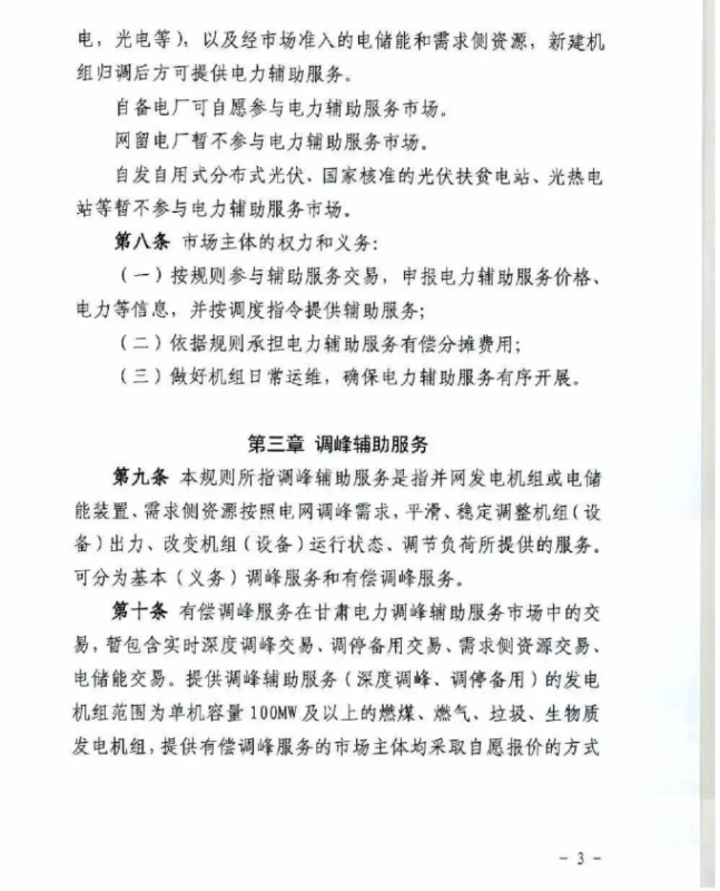 中國(guó)儲(chǔ)能網(wǎng)訊:4月10日,國(guó)家能源局甘肅監(jiān)管辦公室發(fā)布關(guān)于征求《甘肅省電力輔助服務(wù)市場(chǎng)運(yùn)營(yíng)規(guī)則(征求意見稿)》意見的函,意見稿規(guī)則較2019年發(fā)布的暫行補(bǔ)償價(jià)格有較大改變。調(diào)頻輔助服務(wù)補(bǔ)償價(jià)格由上限15元/MW下調(diào)至12元/MW。調(diào)峰輔助服務(wù)申報(bào)價(jià)格非現(xiàn)貨期間為0.5元/kWh,現(xiàn)貨期間為0.3元/kWh。