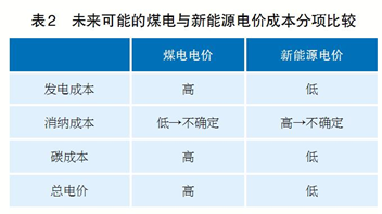 但是,我們也需要知道,在未來,這三類成本的高低比較可能發(fā)生變化。首先因?yàn)槊禾咳匀皇且环N有限的資源,而風(fēng)、光等資源是取之不竭用之不盡的,煤電的發(fā)電成本將繼續(xù)高于新能源。而新能源的消納成本高低則取決于能源技術(shù)進(jìn)步的速度與方向,以及在高比例可再生能源的條件下,傳統(tǒng)煤電的消納成本是否還可以保持在較低水平。對于新能源而言,技術(shù)進(jìn)步的一個(gè)重要方向是實(shí)現(xiàn)從發(fā)電成本與消納成本之間由替代關(guān)系到互補(bǔ)關(guān)系的轉(zhuǎn)化。即發(fā)電成本下降的同時(shí)也能實(shí)現(xiàn)消納成本的有效下降,這是新能源價(jià)格較之煤電價(jià)格占優(yōu)的關(guān)鍵所在。當(dāng)然,技術(shù)進(jìn)步也可能存在不確定性,但我們有信心相信在有效的技術(shù)進(jìn)步的速度與方向下,以新能源為主體的新型電力系統(tǒng)中新能源電價(jià)較之煤電電價(jià)有優(yōu)勢(見表2)。
