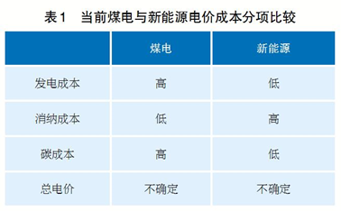 因此,綜合三個(gè)方面的成本,消費(fèi)者面臨的電價(jià)=發(fā)電成本+消納成本+碳成本,當(dāng)前煤電與新能源的電價(jià)成本分項(xiàng)比較如表1所示??梢钥吹剑诋?dāng)前的成本結(jié)構(gòu)與成本比較下,難以簡單判斷新能源電價(jià)一定比煤電電價(jià)有優(yōu)勢。
