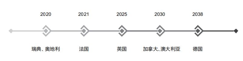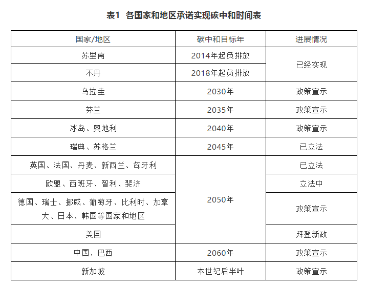 2050年是全球?qū)崿F(xiàn)碳中和目標的主要時間節(jié)點,包括歐盟、美國、法國、英國、葡萄牙、瑞士、智利、日本、韓國、南非等近30個國家和地區(qū)計劃在2050年實現(xiàn)碳中和。少數(shù)國家計劃更早實現(xiàn)碳中和,其中烏拉圭為2030年,芬蘭為2035年,冰島和奧地利為2040年,瑞典和蘇格蘭為2045年。中國于2020年9月的聯(lián)合國大會上明確提出,二氧化碳排放力爭于2030年前達到峰值,努力爭取2060年前實現(xiàn)碳中和。巴西碳中和目標時間亦為2060年。新加坡僅提出本世紀下半葉實現(xiàn)碳中和,而未明確具體年份。