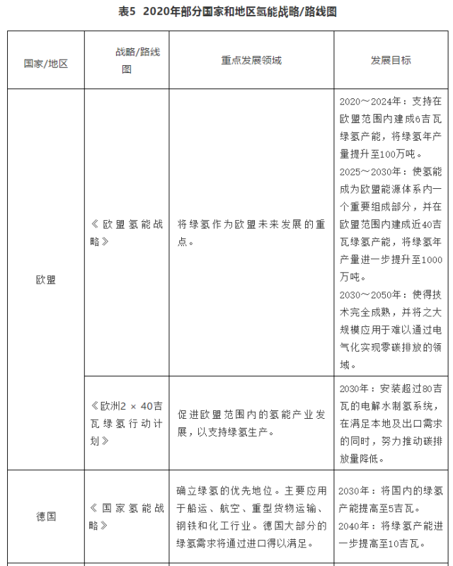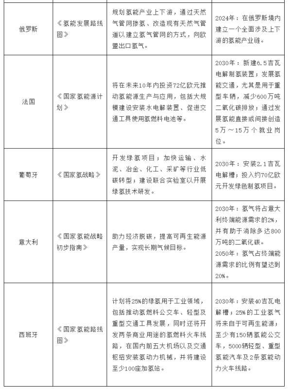 2020年,多個國家和地區(qū)加快布局氫能產(chǎn)業(yè),相繼出臺具有實操性的氫能戰(zhàn)略和氫能發(fā)展路線圖。歐盟發(fā)布《歐盟氫能源戰(zhàn)略》,計劃到2030年擁有40吉瓦生產(chǎn)能力,到2050年將氫能在能源結(jié)構(gòu)中的占比提高到12%~14%。德國和法國分別發(fā)布和啟動《國家氫能戰(zhàn)略》,正式確定綠氫的優(yōu)先投資地位。德國公布的1300億歐元規(guī)模的經(jīng)濟復蘇計劃中,提出至少投入90億歐元發(fā)展氫能。荷蘭政府公布氫能戰(zhàn)略,表示將在2025年前完成500兆瓦可再生能源制氫項目。俄羅斯加速布局氫能產(chǎn)業(yè),搶占氫能出口主導權(quán)。根據(jù)新版《2035年能源戰(zhàn)略草案》(ES-2035)制定的目標,俄羅斯2024年氫能出口量計劃達到20萬噸,2035年達到200萬噸,力求到2035年通過擴大氫氣產(chǎn)能成為全球重要氫能經(jīng)濟國家。另外,葡萄牙、西班牙等國紛紛發(fā)布國家級氫能路線圖。葡萄牙希望通過天然氣管網(wǎng)注入氫氣,成為第一個大規(guī)模利用氫能的歐洲國家。西班牙宣布將在2030年建成4吉瓦可再生能源制氫產(chǎn)能,正式加入歐洲發(fā)展氫能產(chǎn)業(yè)的聯(lián)盟。