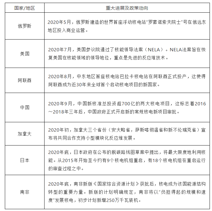 核電作為一種低碳排放的電力,對于全球電力系統(tǒng)實現(xiàn)低碳轉(zhuǎn)型起到重要助力作用。多國將核電作為能源結(jié)構(gòu)轉(zhuǎn)型的重要力量。經(jīng)合組織的核能部門2020年發(fā)布了關于疫情過后的恢復計劃,其中就包括進一步提升核電業(yè)的成本效益、通過核電項目創(chuàng)造更多高價值就業(yè)機會、在新的經(jīng)濟復蘇計劃中為核電業(yè)爭取更多資金支持,以及利用核電建設帶動電力基礎設施低碳化等。日本在2020年底公布的脫碳路線圖草案中提出,將最大限度地利用核能。阿聯(lián)酋首座核電站于2020年8月投入運行。南非新版《國家綜合資源計劃》2020年底獲批,其中明確規(guī)定南非將以“負擔得起的規(guī)模和速度”發(fā)展核電,初步計劃新增250萬千瓦裝機。2020年9月,中國正式開啟新的常規(guī)核電新項目審批。2021年3月,海南昌江核電項目3、4號機組獲頒建造許可證。