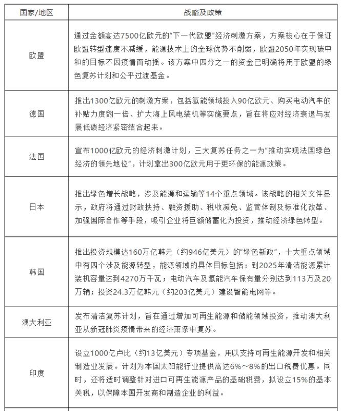 2020年,全球不少區(qū)域組織和國家提出后疫情時代的經(jīng)濟刺激計劃,推出綠色增長戰(zhàn)略,創(chuàng)造經(jīng)濟與環(huán)境的良性循環(huán)。歐盟及其多數(shù)成員國在綠色復蘇方面最為積極,將應對全球變暖、實現(xiàn)綠色轉(zhuǎn)型視為拉動經(jīng)濟持續(xù)復蘇的新增長點。日韓等國推行綠色新政,探索疫后經(jīng)濟復蘇的新方式。