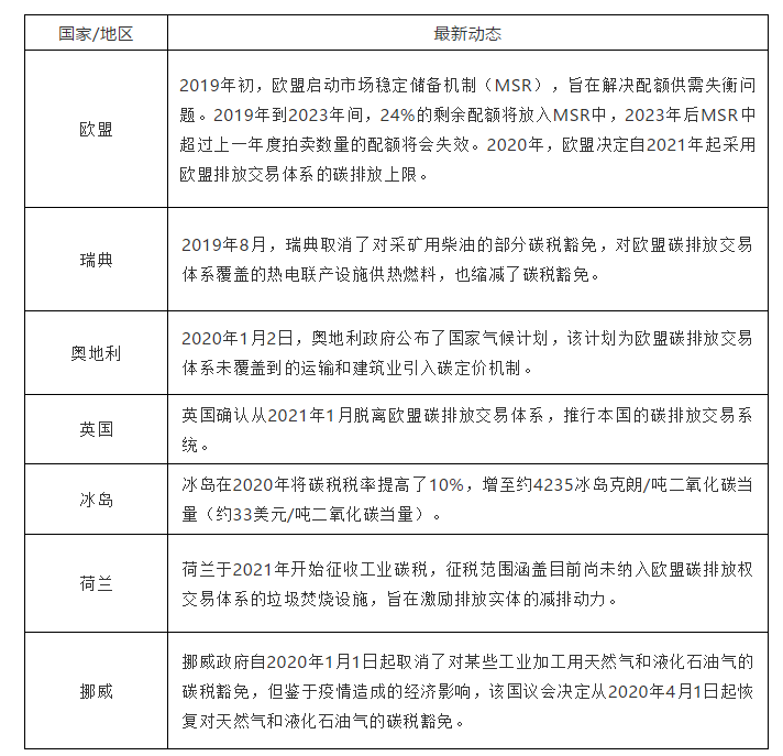 碳稅是以減少二氧化碳排放為目的,對化石燃料按其碳含量或碳排放量征收的一種稅。碳稅制度不同于碳排放權(quán)交易機制,是對能源消費征收的稅費。2019~2020年,加拿大的西北地區(qū)、愛德華王子島和新不倫瑞克省,新加坡、南非等國和地區(qū)開始實行碳稅,截至2020年5月,實行碳稅(費)的國家有24個。