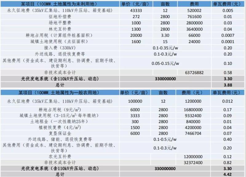 關于土地的成本,除了租金,還有耕地占用稅、城鎮(zhèn)土地使用稅以及青苗補償、場地平整、復墾費等眾多細項。西勘院總圖所所長惠星一份測算數(shù)據(jù)顯示,建設在未利用地、一般農(nóng)田的某100MW光伏電站項目,非技術成本占比達到了15%-19%。除了土地之外,電網(wǎng)接入也是非技術成本中占比最高的一個部分。