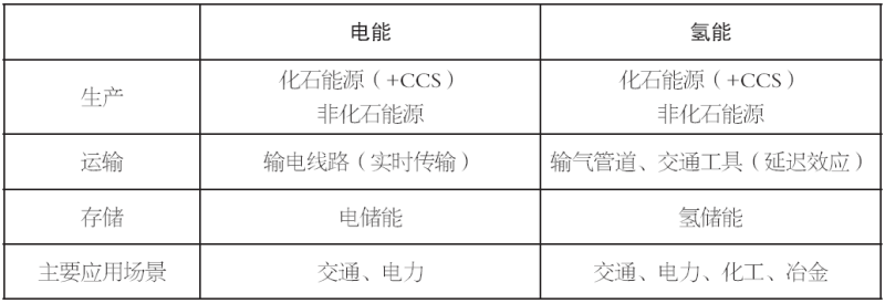 氫能是一種來(lái)源廣泛、清潔靈活、應(yīng)用場(chǎng)景豐富的二次能源。同屬于二次能源的氫能和電能,均可以存在于能源生產(chǎn)、存儲(chǔ)、輸送和消費(fèi)的各環(huán)節(jié),表1所示是電能和氫能的定性對(duì)比分析。從生產(chǎn)的角度說(shuō),電能和氫能均能以化石能源(+CCS)、非化石能源作為原料制?。粡倪\(yùn)輸?shù)慕嵌日f(shuō),電能通過(guò)輸配電網(wǎng)進(jìn)行實(shí)時(shí)傳輸,氫能通過(guò)輸氣管道、陸/海運(yùn)輸方式進(jìn)行輸運(yùn);從存儲(chǔ)的角度說(shuō),電能和氫能都可以進(jìn)行存儲(chǔ)。從消費(fèi)的角度說(shuō),電能和氫能均可以在交通、電力領(lǐng)域進(jìn)行應(yīng)用,是具有能源屬性的。然而,氫能還有電能無(wú)法替代的原料及燃料屬性,可以應(yīng)用于化工和冶金領(lǐng)域,也就是說(shuō),氫能和電能最大的區(qū)別在于氫能是具有物質(zhì)形態(tài)的二次能源。這也就決定了在未來(lái)高比例可再生能源系統(tǒng)中,氫能可以作為清潔電力的有力補(bǔ)充,在能源領(lǐng)域發(fā)揮獨(dú)特的優(yōu)勢(shì)。