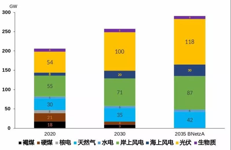 在2021年修訂的可再生能源法案中,德國制定目標,2030年光伏裝機要達到100GW,海上風電和岸上風電分別達到20GW和71GW。德國聯邦網絡管理局在年初發(fā)布的2035電網規(guī)劃草稿中,預期煤電完全退出,風電和光伏裝機量繼續(xù)增長,同時也規(guī)劃了一定的儲能和氫能。
