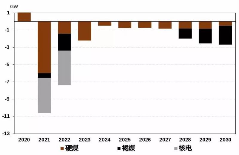 圖5 2020至2030年德國煤電和核電機組容量變化(GW)