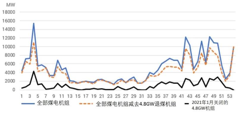 北歐電力分析機構EnergyQuantified估算,年初關停4.8GW煤電,使得德國日前電價峰值上漲約10歐元/MWh。圖4顯示了2020年第1至53周德國煤電機組運行容量的變化,藍色線為全部機組,黑色線則為2021年關閉的第一批4.8GW煤電機組??梢钥闯?,在2020年的高峰時段,這些機組最高供應了4GW的電力,一半時段有2GW在運行,只有第二三季度的運行容量較低。也就是說,2021年初寒潮推高德國用電負荷的時段,這些被關閉的煤電機組原本可以提供2-4GW的電力,但是現在只能由成本更高的機組來填補缺口,所以使得峰值電價更高。