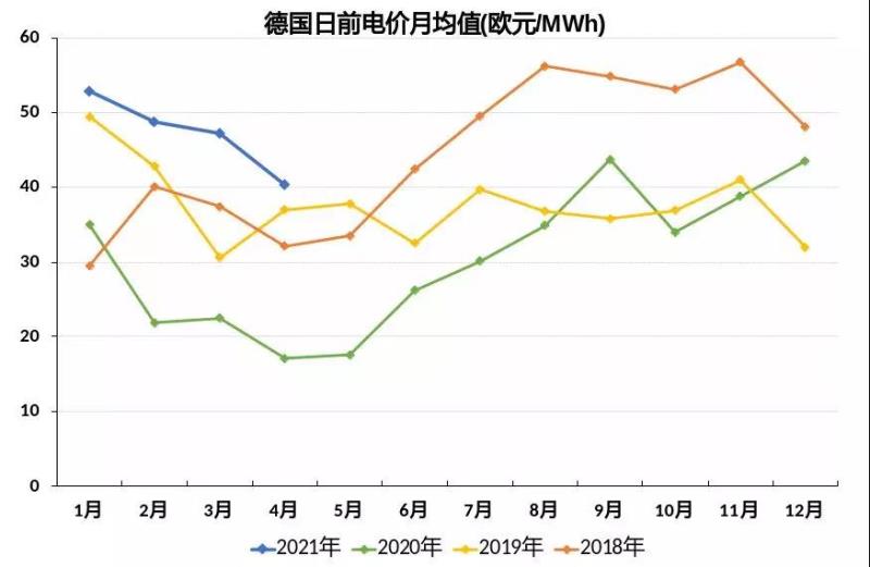 圖3 2018年至2021年德國日前電價月均值(歐元/MWh)