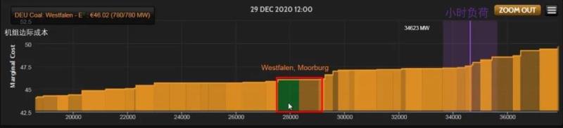 然而,這些較新的煤電廠因為邊際成本低,在日前電力市場的優(yōu)先次序曲線中占有優(yōu)勢,如下圖2所示,所以Moorburg和Westfalen這樣的煤電廠關停退出電力市場,意味著需要其他相對較舊和邊際成本較高的機組來填補這個缺口,因此推高現貨出清電價。