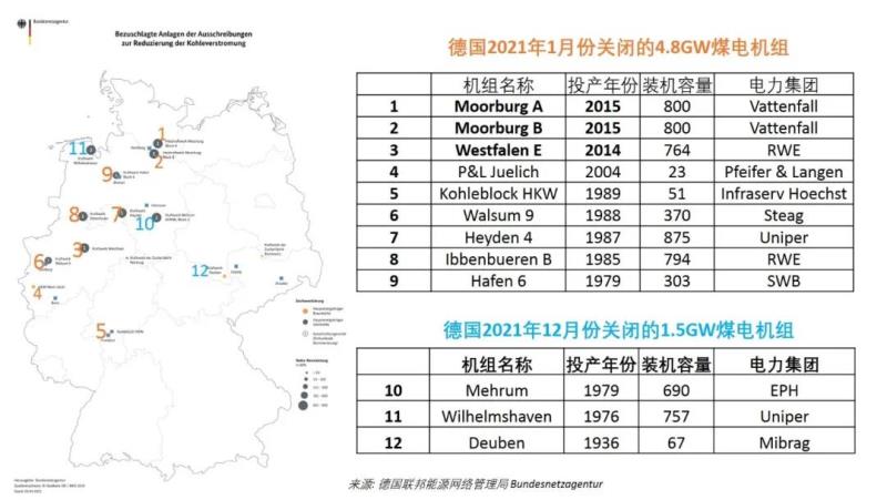 圖1 德國2021年1月份和12月份分別關閉的4.8GW和1.5GW煤電機組名單