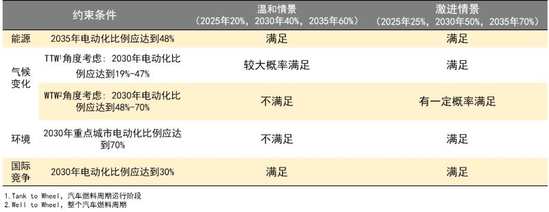 采用自上而下的方法,根據(jù)能源、氣候變化、環(huán)境、國(guó)際競(jìng)爭(zhēng)四個(gè)方面的外部約束提出關(guān)鍵節(jié)點(diǎn)的電動(dòng)化發(fā)展目標(biāo)。提出兩種情景模式,一是溫和情景目標(biāo)下,2025年新能源汽車銷量占比應(yīng)達(dá)到20%,2030年占比40%,2035年占比60%;二是激進(jìn)情景目標(biāo)下2025年新能源汽車銷量占比應(yīng)達(dá)到25% ,2030年占比50%,2035年70%。